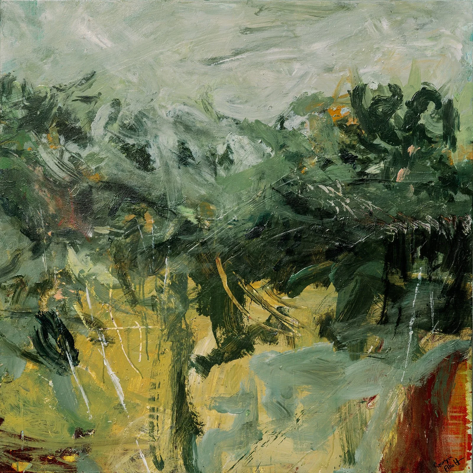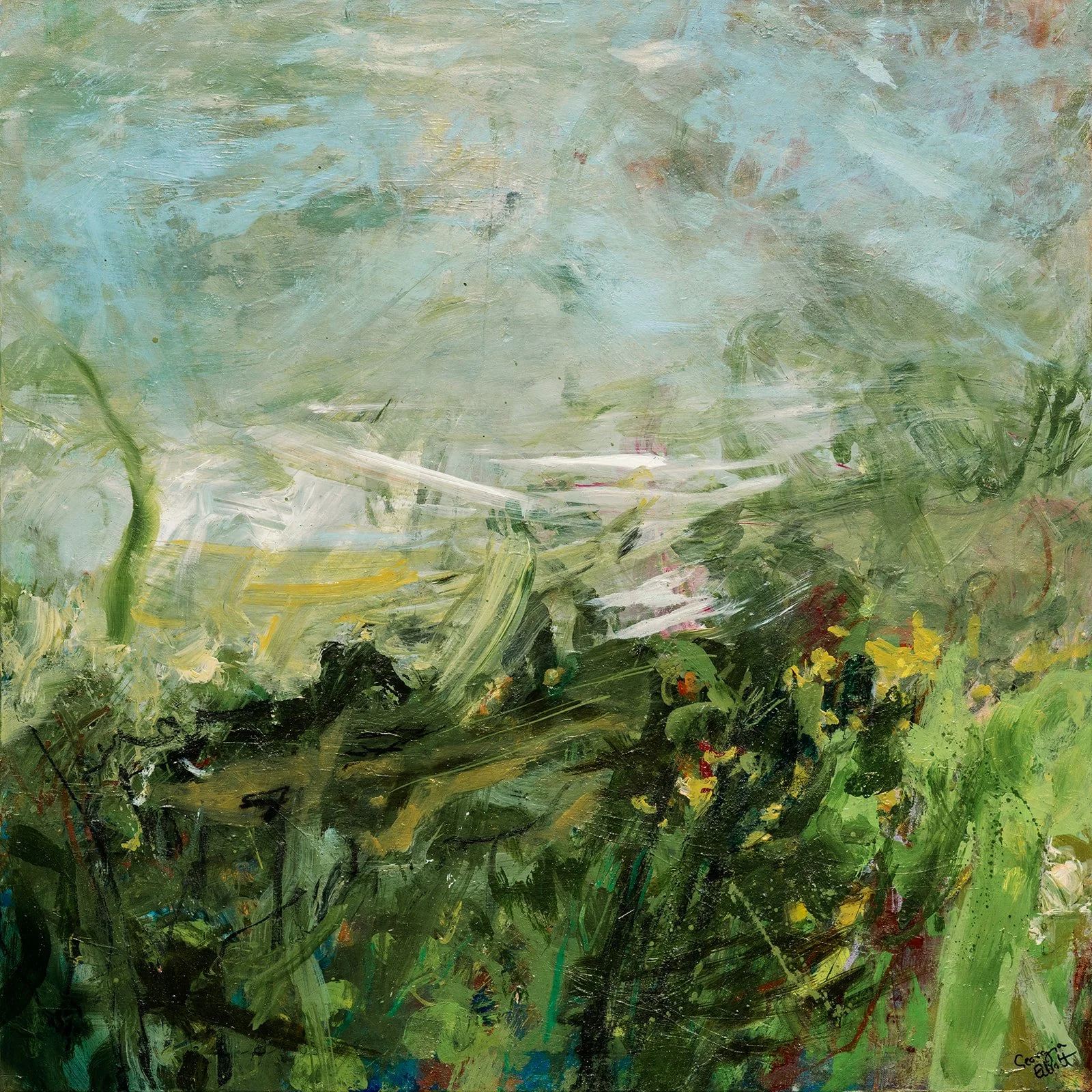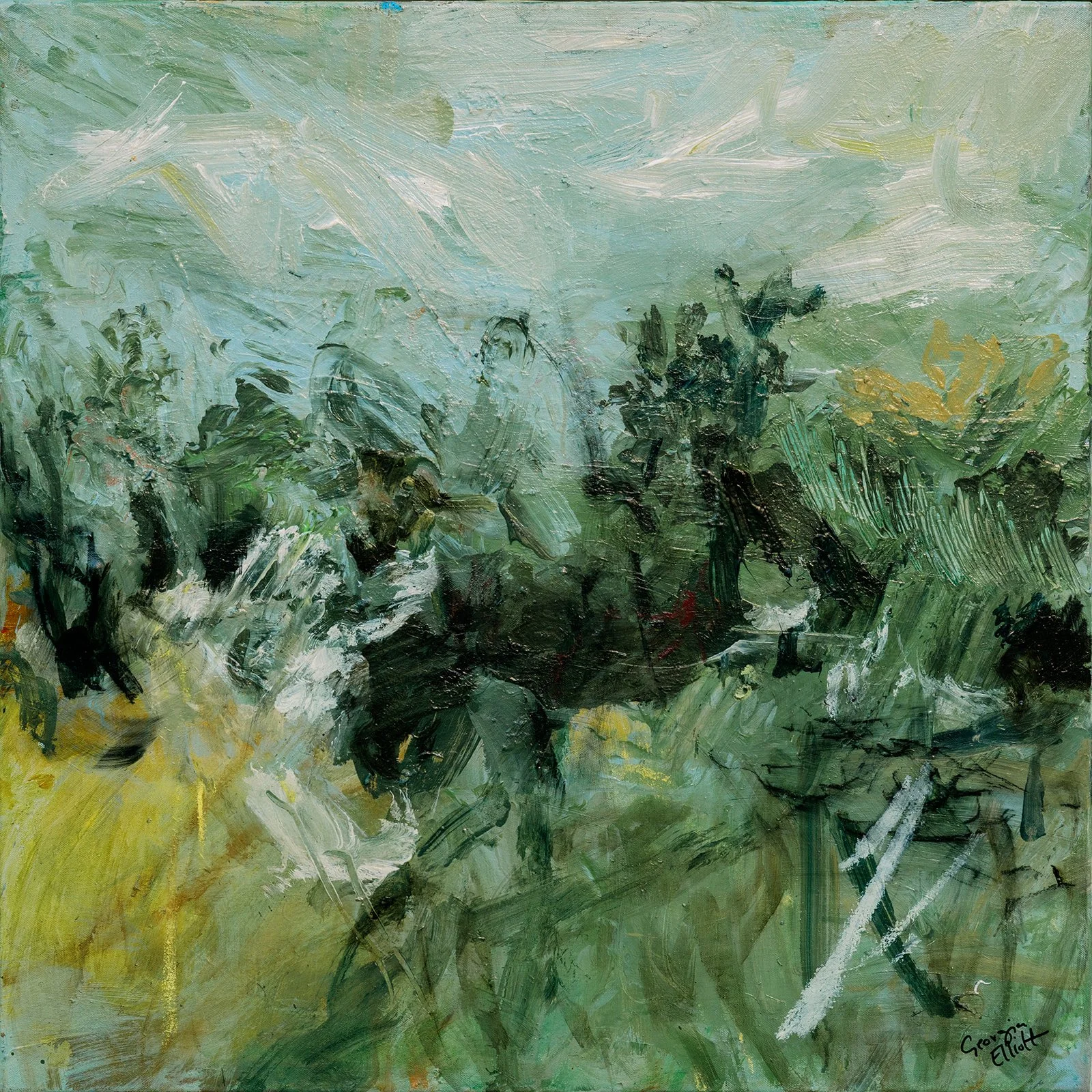 Moving through the trees to Lydia’s favourite tea drinking spot, looking out over wild fields where the birds danced, it felt alive. 104 x 104cm Framed in white £2,100 Original painting acrylic and oil on canvas with UV varnish.