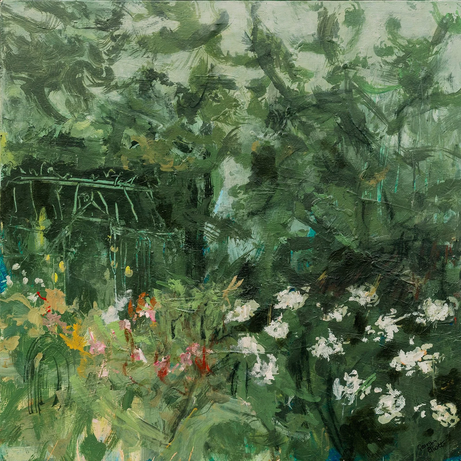 I just had to capture the stunning greenhouse, where all the gardening magic happens, engulfed by greenery and light breaking through the trees. 104 x 104cm framed, original painting acrylic and oil on canvas, UV varnish. SOLD